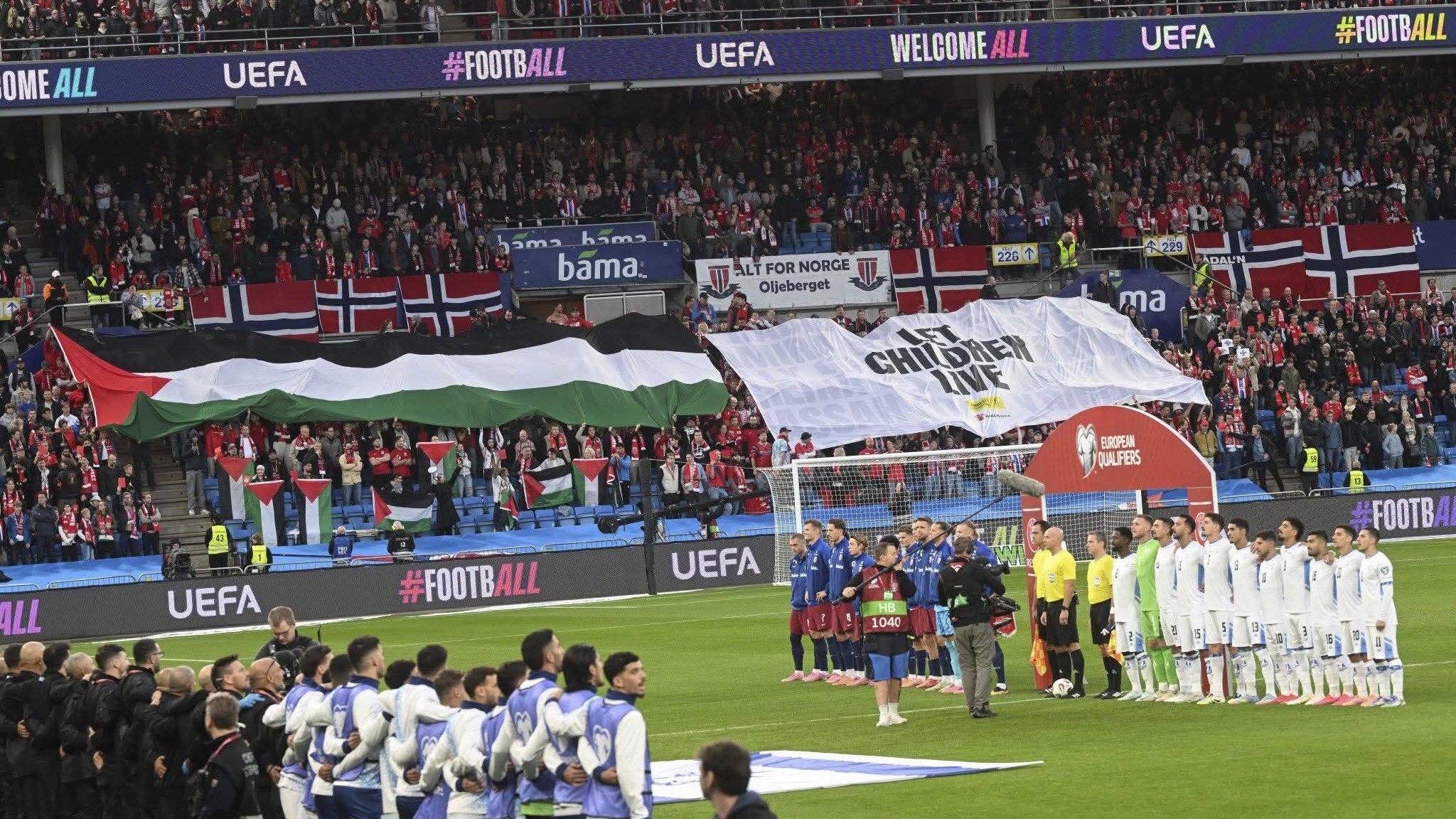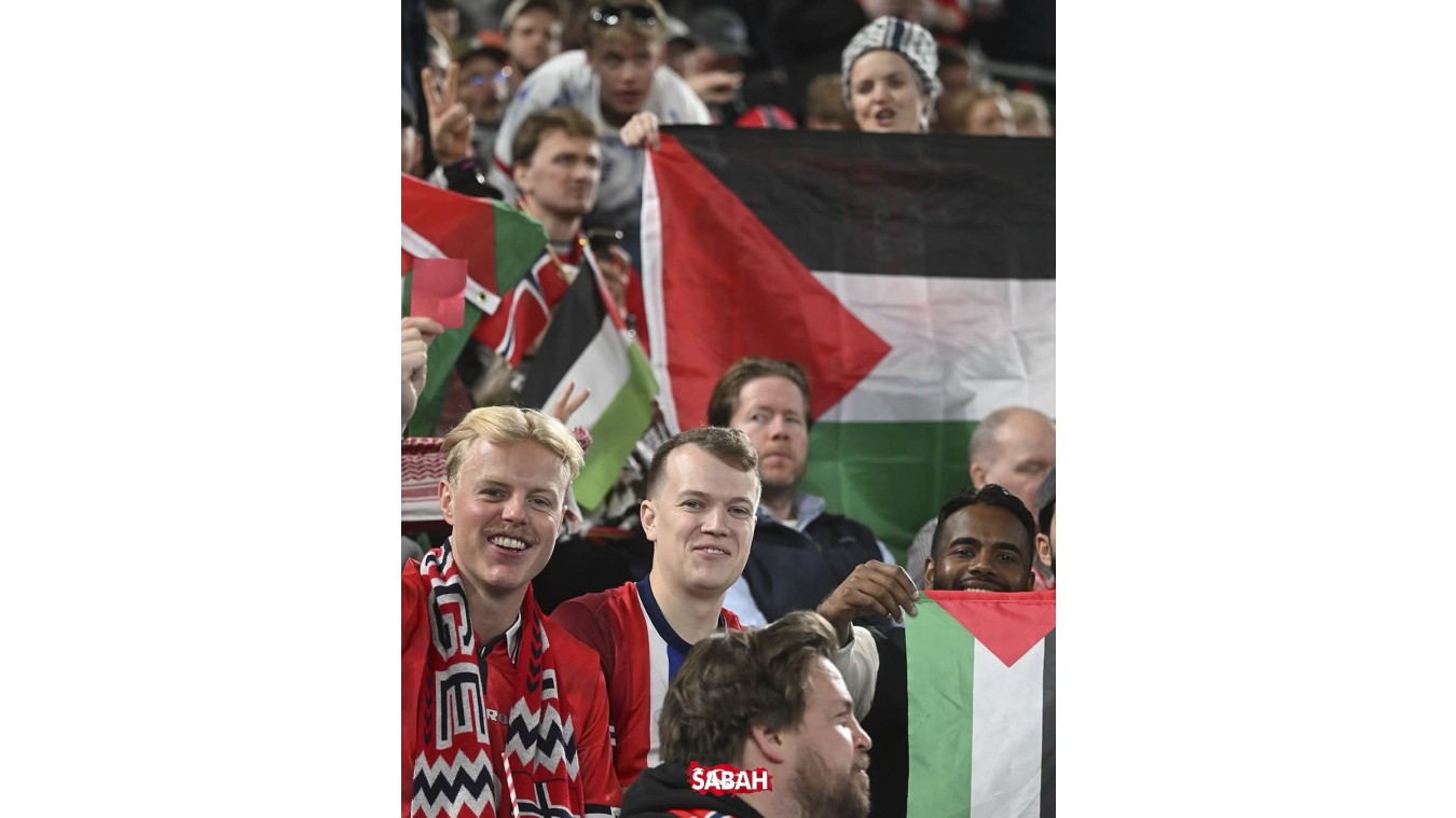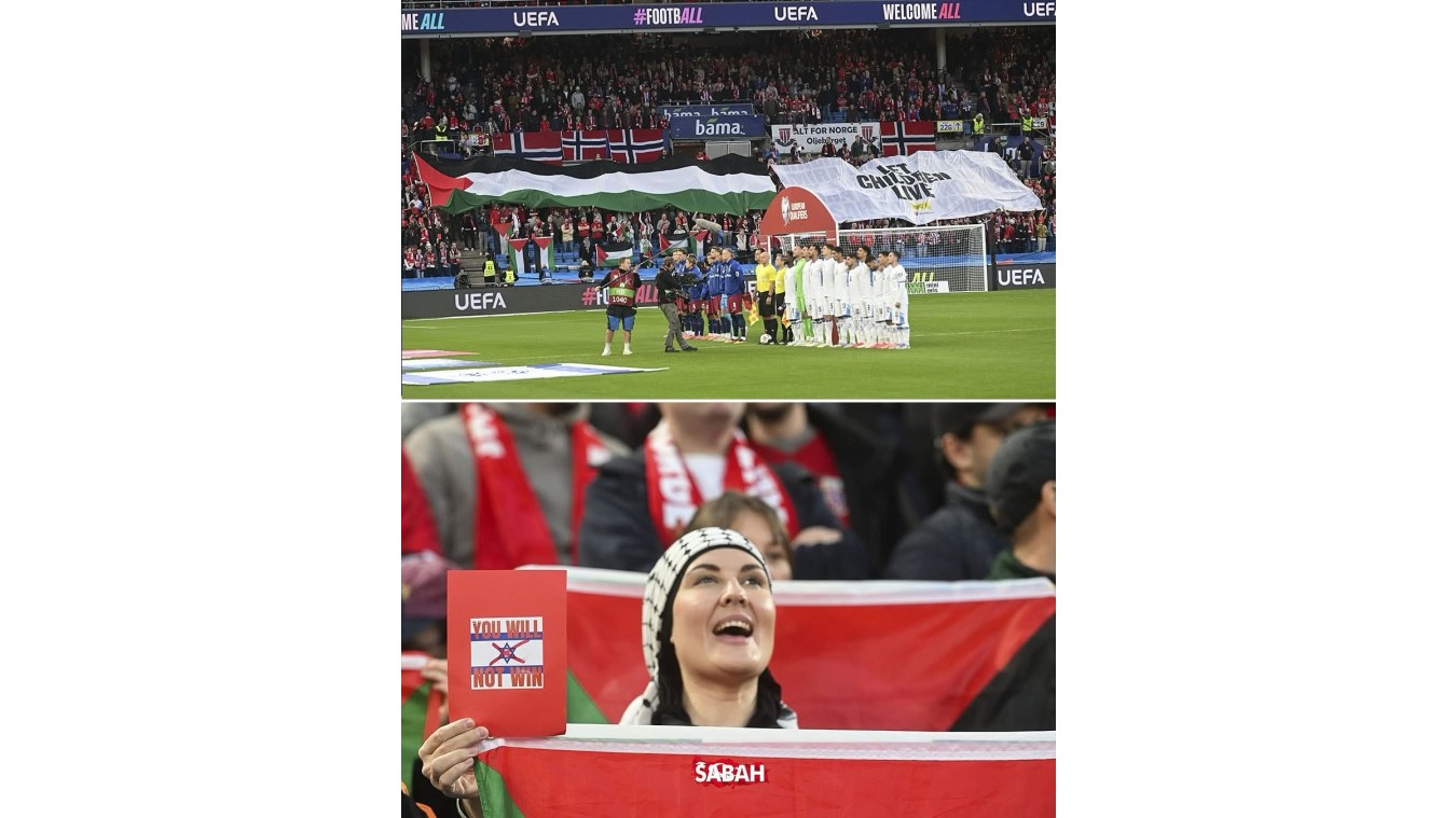 📌Norveç azarkeşləri oyuna Fələstin bayraqlarıyla gəliblər. Fanatlar Fələstinə azadlığın verilməsini tələb ediblər, "Soyqırımçı İsrail" şüarını səsləndiriblər.